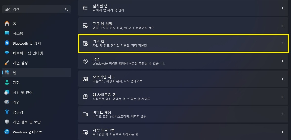 설정 창이 열리면 왼쪽에 있는 ‘앱’ 항목을 클릭한 뒤, 오른쪽에서 ‘기본 앱’을 선택합니다. 이 메뉴에서는 파일 확장자별로 기본으로 연결된 앱들을 확인할 수 있습니다.